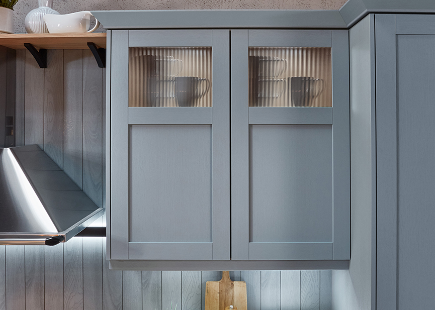 The FRAME handled door is available in lacquered laminate with anti-fingerprint coating, face side with polymer edge in front colour. Internal door face is in front colour. Matching surround, upright panels and plinth. Available as full glazed or partially glazed.